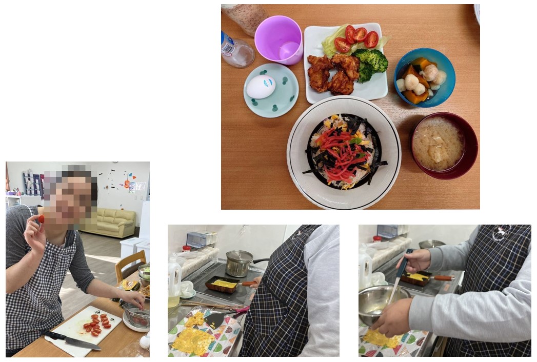 食材を切る、味噌汁用の味噌の準備(量)、薄焼き卵など本人ができる事を少しずつ増やしながら、