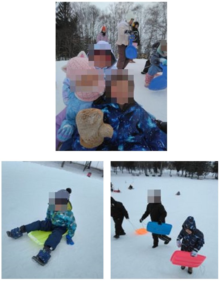 そりは、一人で滑ったり、複数人で一つのソリに乗って滑ったり、スタッフに後ろに乗ってもらって滑ったりするなど、思い思いに楽しむことができました。