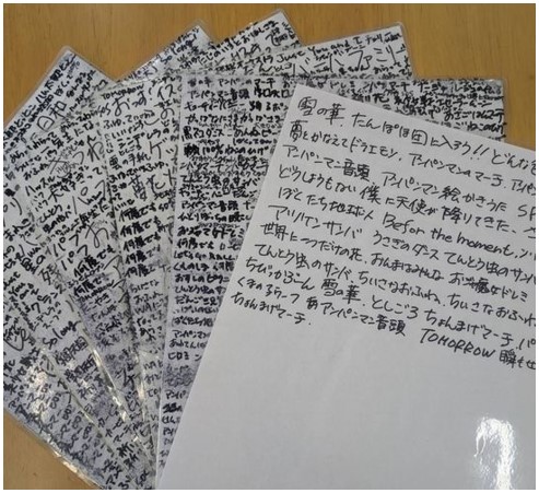 一緒に作った「手作りの歌本」(利用者さんの指示を受け指導員が書いています)は、